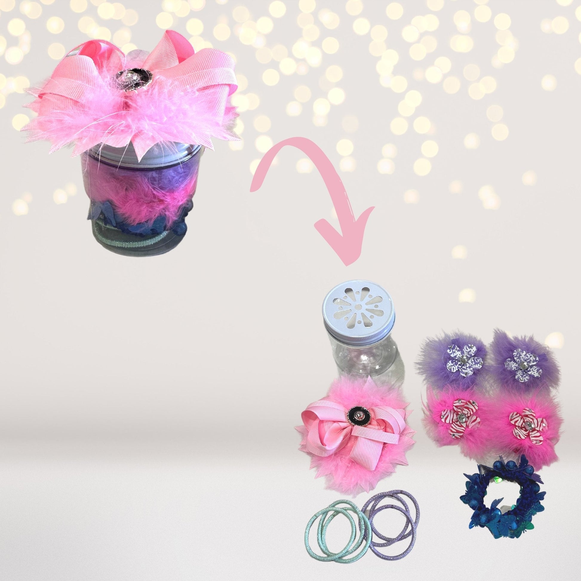 Fun Party Favors: The party favor jars are filled with 6 hair elastics, 4 marabou feather flower hair clips, 1 blue butterfly ponytail holder, and 1 large pink marabou hair bow â€?perfect for some pampering fun! 🎀💖