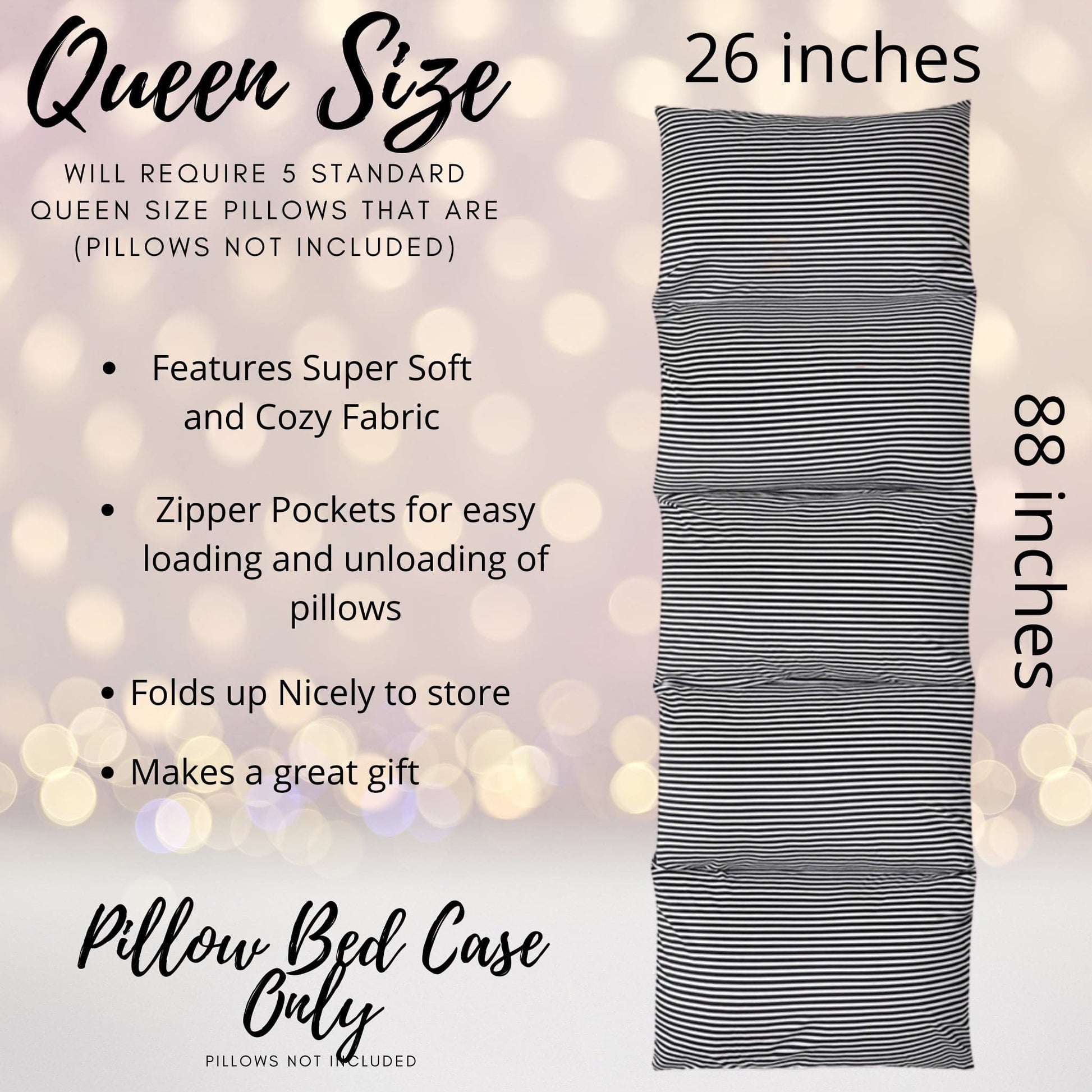 Comfortable Pillow Bed: The black and white stripe pillow bed slipcover is made of soft polyester and measures 88x26 inches. It has five zippered pockets that hold queen-sized pillows (not included), allowing you to choose the comfort level. The slipcover is machine washable and can be folded and stored easily when not in use. 🛏️ðŸŒ?/p>